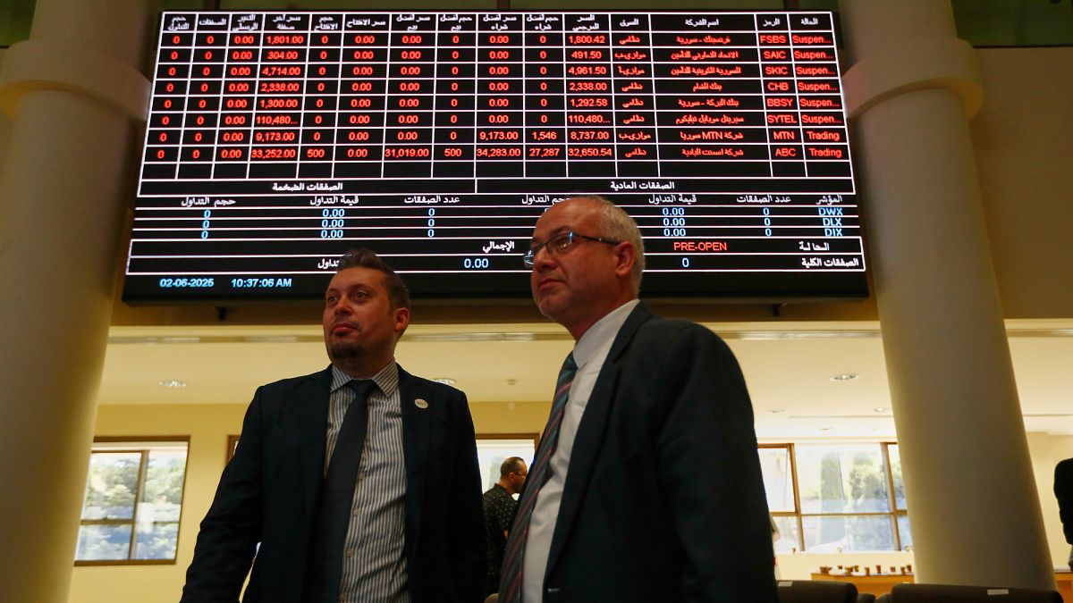 A damaszkuszi értéktőzsde 2025. június 2-án újra megnyitotta kapuit, miután féléves zárva tartás után végre ismét lehetőség nyílt a kereskedésre. Az előző hat hónapot a szélsőséges iszlamista erők okozta zűrzavar jellemezte, mely során a szír nagyvárosok gyorsan megszállás alá kerültek. Az árfolyamokat mutató elektronikus táblák alatt két férfi állt, akik a pénzügyi piacok újraéledését figyelték.